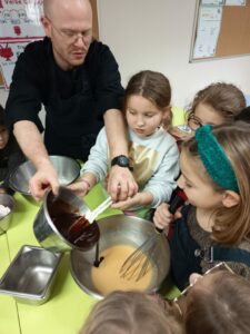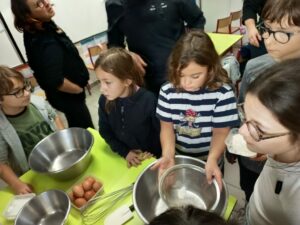Bain-marie, tamisage de la farine, cassage des oeufs, remplissage des poches à douille puis mise en moule, chacun a pu participer aux différentes étapes de la recette.