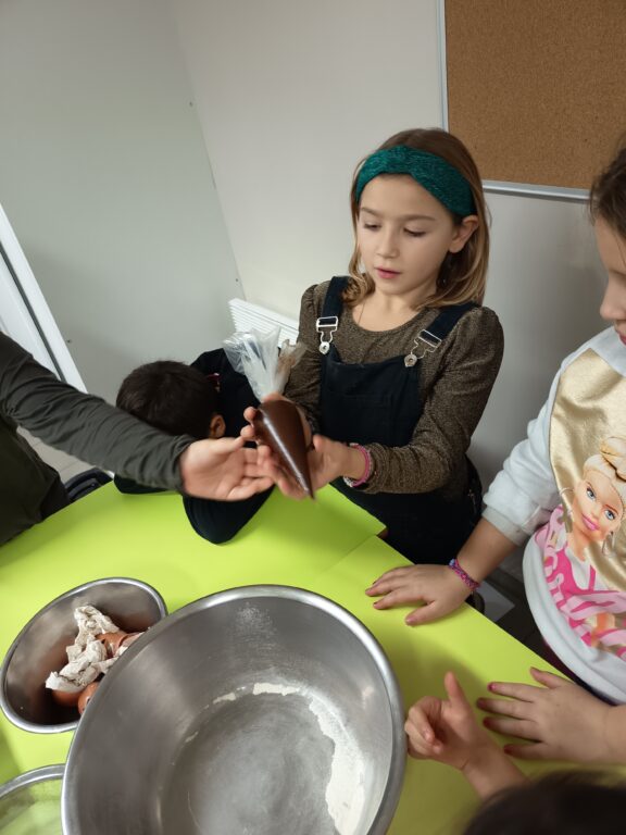 Bain-marie, tamisage de la farine, cassage des oeufs, remplissage des poches à douille puis mise en moule, chacun a pu participer aux différentes étapes de la recette.